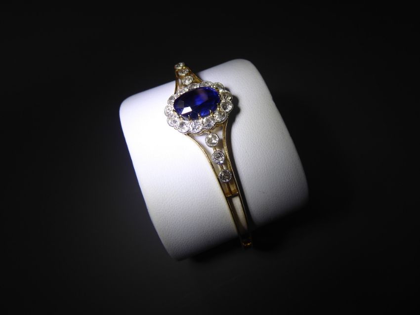 Watch the auctionAn Antique Yellow Gold Royal Blue 5 Carat Natural Ceylon Sapphire and Diamond Bracelet. The bracelet set with an oval sapphire surrounded by 3 satellite set diamonds to shoulders, sapphire approx 11.25 x 8.54 x 7.00 cts and set with approx 1.14 cts of old cut diamonds to surround and shoulders, total approx wt 13.2 gms.