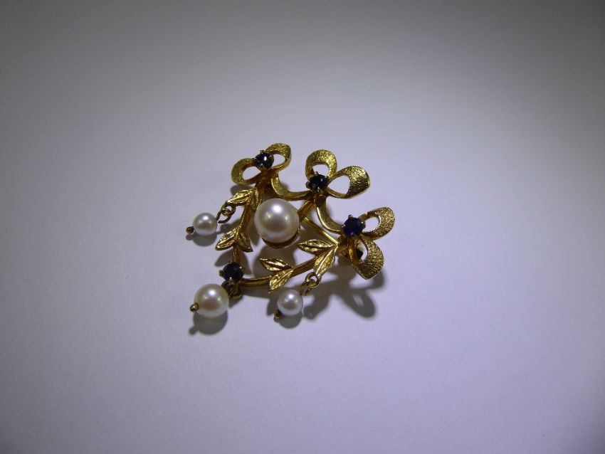A 9ct Yellow Gold Sapphire and Pearl Brooch, the shield form brooch decorated
