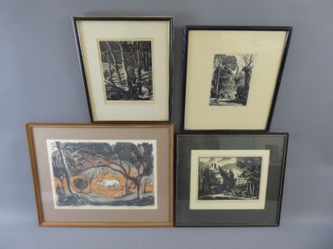Barbara Greg, English (1900-1983) Two Woodblock Prints, the first entitled 'Oxen Ploughing', framed and glazed, approx 39 x 26 cms, the second 'Birds in Roper's Park' together with two further prints depicting a 'Chateau in France' taking delivery of goods and 'Deer in a Forest', all four woodblocks prints are signed in pencil to the margin.