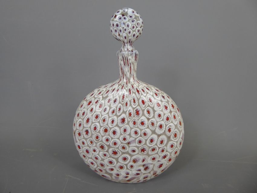 A Murano Glass Bottle and Stopper, with cranberry canes on white ground, approx 21 cms.