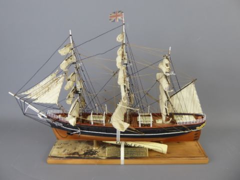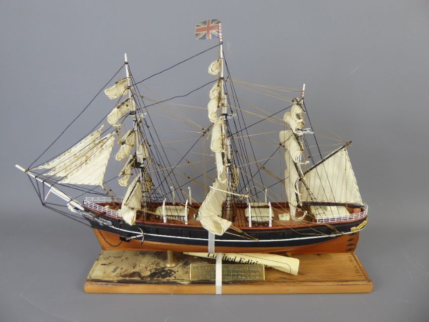 A Nauticalia Limited Edition Model of the Cutty Sark Sailing Ship in full sail, model no. 0546 of 1869. The model main mast is approx 31 cms high x 32 cms, mounted on a plinth claimed to be a section of timber decking that was salvaged during her current restoration (2006-2009).