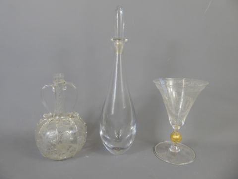 Antique Glass, including a delicate hand blown-bottle decanter, Whitefriars Commemorative glass and a contemporary decanter and stopper. (3)