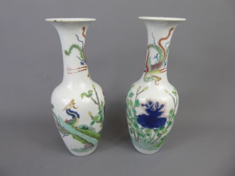 A Pair of Antique Chinese Porcelain Famille Verte Vases, depicting mythical birds amongst tree peony, approx 30 cms. The vase with six character Kangxi marks to base within concentric circles.
