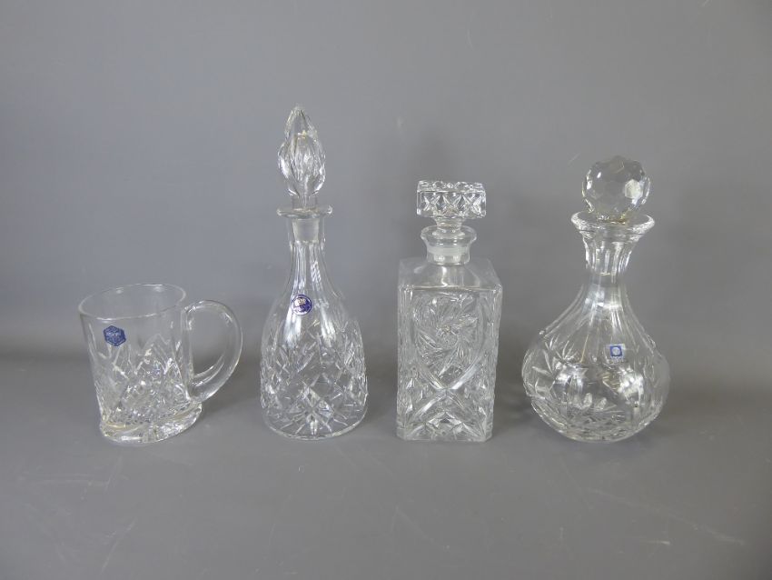 Three Cut Glass Decanters and Stoppers, including two Thomas Webb and one Parka Crystal, together with a Stuart Crystal Tankard. (4)