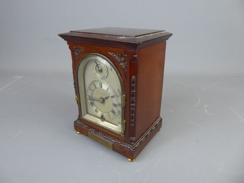 A late 19th Century Mahogany-Cased Desktop Clock, mounted on brass button feet, made by Goldsmiths & Silversmiths Co Ltd, London, the rectangular case with cornice above rounded top silvered dial with Roman numerals and engraved with retailer, the movement made by Astral of Coventry, No 29711. The bottom of the case bears a brass plaque inscribed with 'Unstead Cottage 1927-1934'.