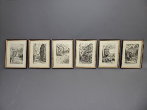 Six Black and White Dry Point Etching Prints, depicting Parisian scenes, approx 13 x 19 cms.