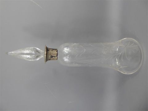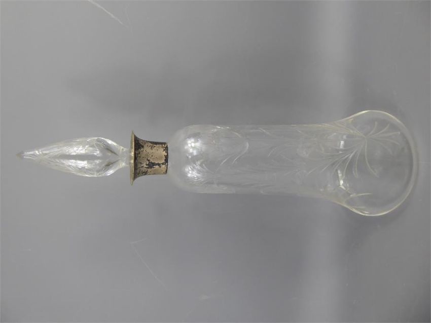 An Antique Cut Glass Silver Collared Decanter depicting a flower.