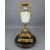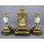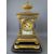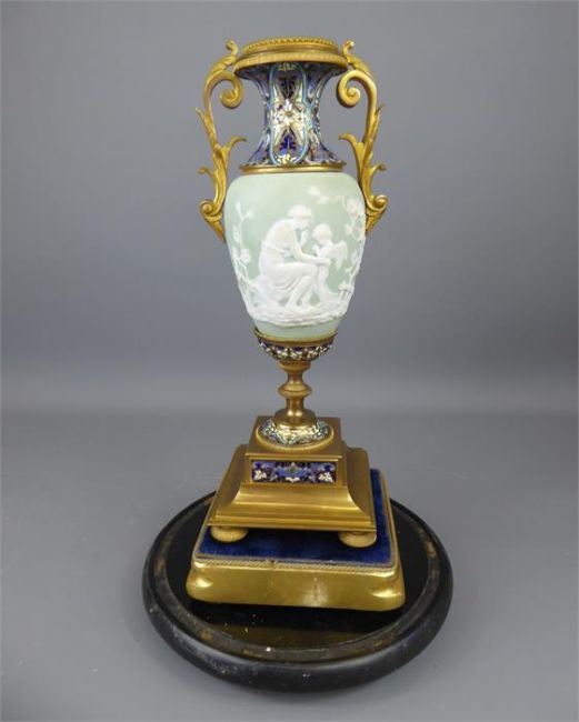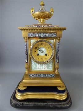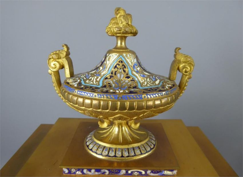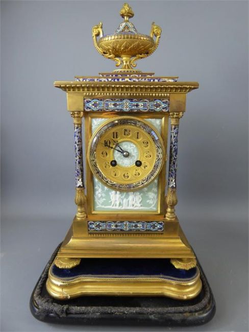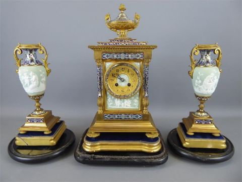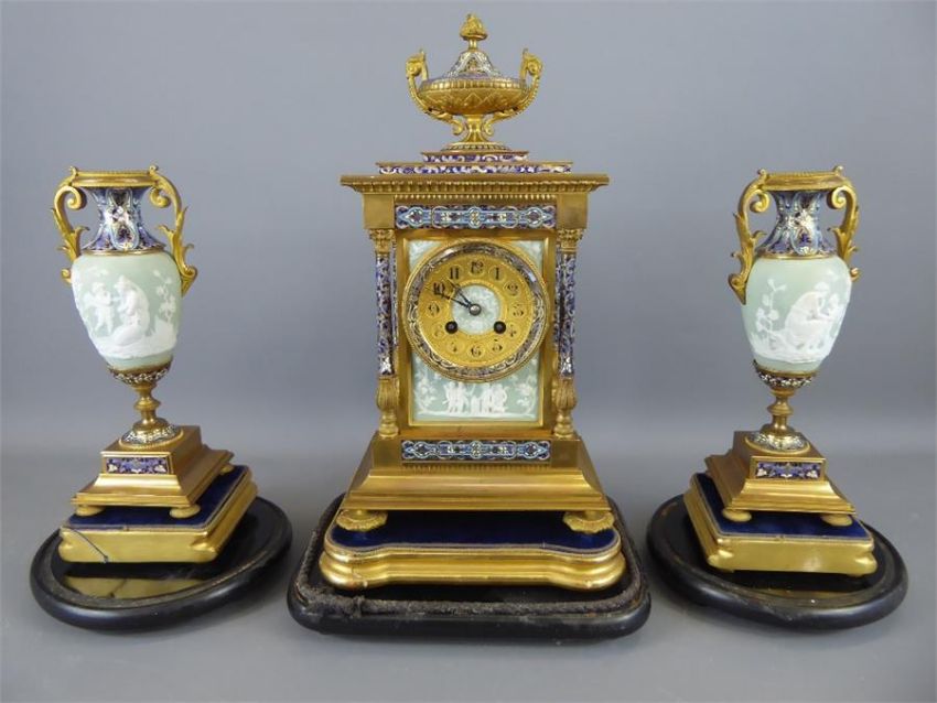 A Late 19th Century French Gilt Brass Champleve Enamel Mantel Clock and Garniture, the mantel clock with gilt brass face and numeric dial, inset with Wedgwood parian panels, the clock face with Wedgwood plaque and champleve enamel surround. The clock face flanked by two free-standing champleve enamel cast columns. The clock raised on a stepped plinth with four rosette feet. The clock movement stamped Marti et Ci, Medaille d' Argent 1889, striking on a coiled steel gong. The top mounted with a decorative champleve enamel urn. The clock raised on an oval velvet and gilt wood base with glass dome. The companion Garniture of similar Wedgwood and Champleve design, depicting a classical scene, approx 30 cms, with plinth and glass domes.