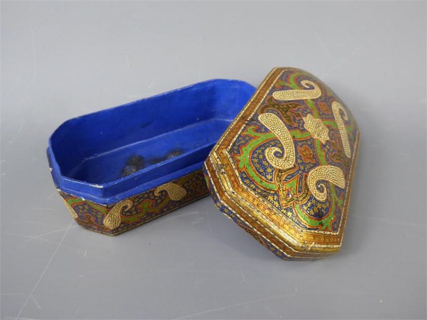 A Kashmir 20th Century Papier Mache Lidded Box, the box decorated with the Boteh motif, approx 11 x 6.5 cms.