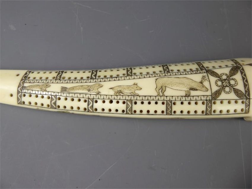 An Antique Alaskan Inuk Marine Ivory Cribbage Board, crafted from Walrus tusk, scrimshaw work depicting a figure in a kayak, seal, walrus, wolf and elk, approx 33 cms.