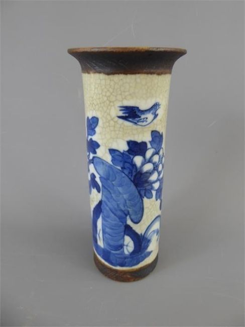 A Chinese Crackle Glaze Pillar Vase, depicting a flowering plant with bird, approx 20 cms.