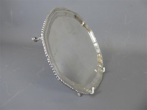 A Silver Card Tray, with scalloped edge, raised on four hoof feet, approx 20 cms diameter, mm Barker Bros, dated 1926, approx 390 gms.
