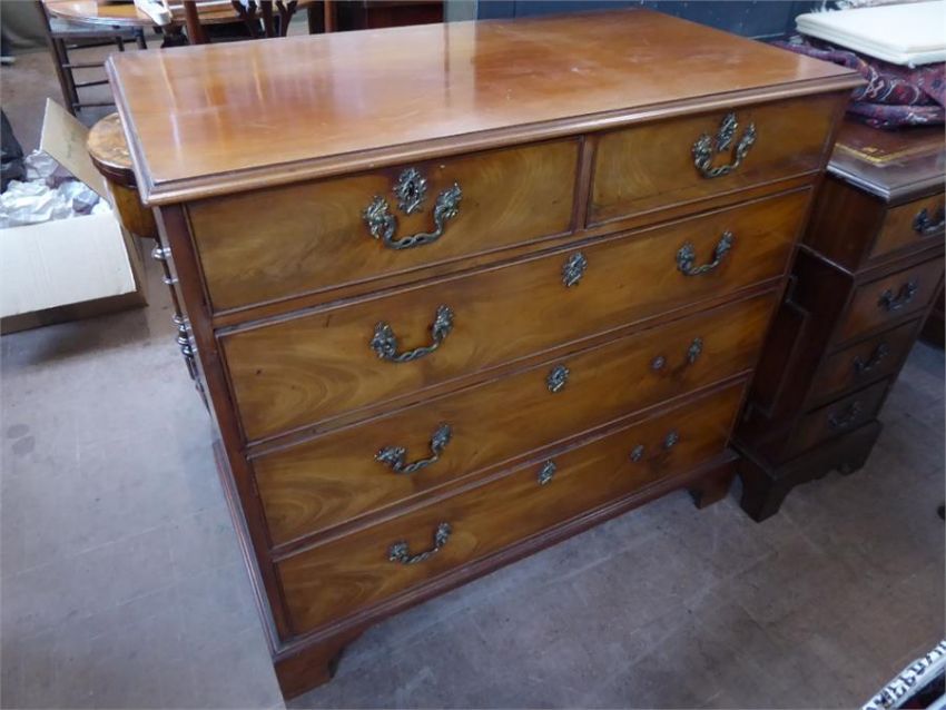 An Antique Mahogany Chest of Drawers, with two short and three long graduated drawers, on bracket feet, brass swan neck handles, approx 98 x 95 x 52 cms.