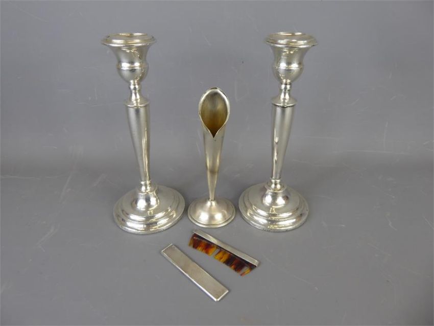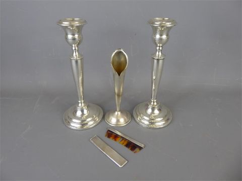 A Pair of Antique Silver Candle Sticks, all marks rubbed, approx 25 cms, together with a brushed silver bud vase, Sheffield hallmark, dated 1903, mm J.R and a gentleman's silver pocket comb. (2)