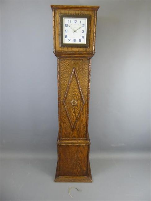 An Oak Cased Art Deco Clock, with square face and numeric dial with decorative carved ribbing around the dial, approx 23.5 x 19.5 x 42.5 cms.