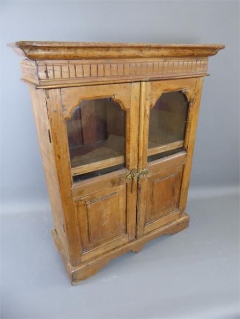 An Oak Indian Goan Wall Cabinet, the cabinet having two glazed doors with two interior drawers beneath one shelf, approx 66.5 x 26 x 82 cms.