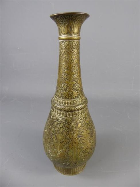 An 18th Century Mogul Brass Bottle Neck Flask, with incised foliate decoration, approx 29 cms.