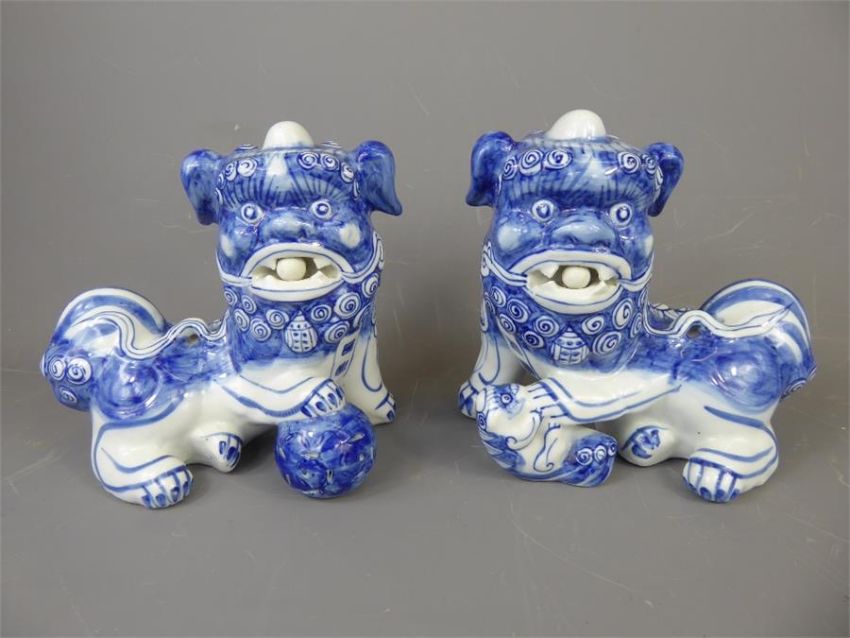A Pair of Blue and White Chinese Foo Dogs, the dogs bearing a thread ball in the mouth and beneath the foot, approx 22 x 25 cms.