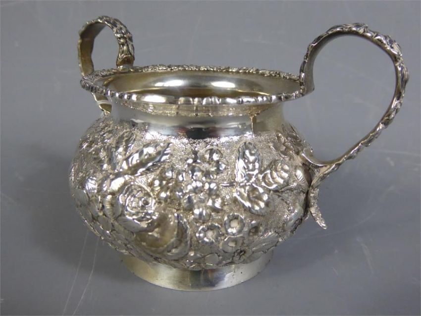 An Antique Indian Silver Sauce Boat, the sauce boat with repousse decoration depicting Indian deity, approx 170.5 gms, together with a sterling silver twin-handled sugar bowl, with repousse floral decoration, approx 154.6 gms. (2)