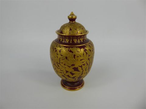 A 19th Century Royal Crown Derby Vase & Cover, the ruby body beautifully decorated with gilded birds and butterflies amongst a foliate ground, circa 1880, approx 15 cms.