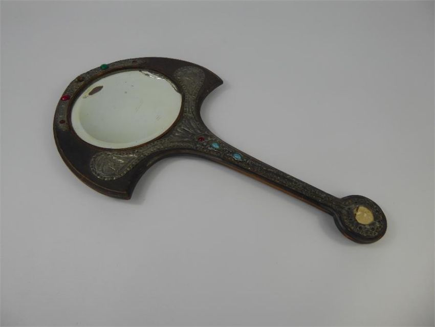 An Art Nouveau Pewter Stone Inlaid Hand Mirror, approx 37 x 19 cms. (af)