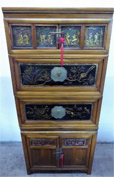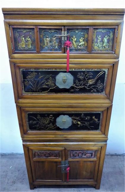 A Chinese Late 19th Century 'Four Seasons' Elm Cabinet, in four parts, with a double cupboard beneath, with two drop front cupboards to the centre and two glazed cupboards above carved with dancing figures in relief. The central drop fronts with further decorative foliate carving highlighted in gilt, approx 172 x 77 x 50 cms. Bears the Shanghai Antiquities Approval Export Seal
