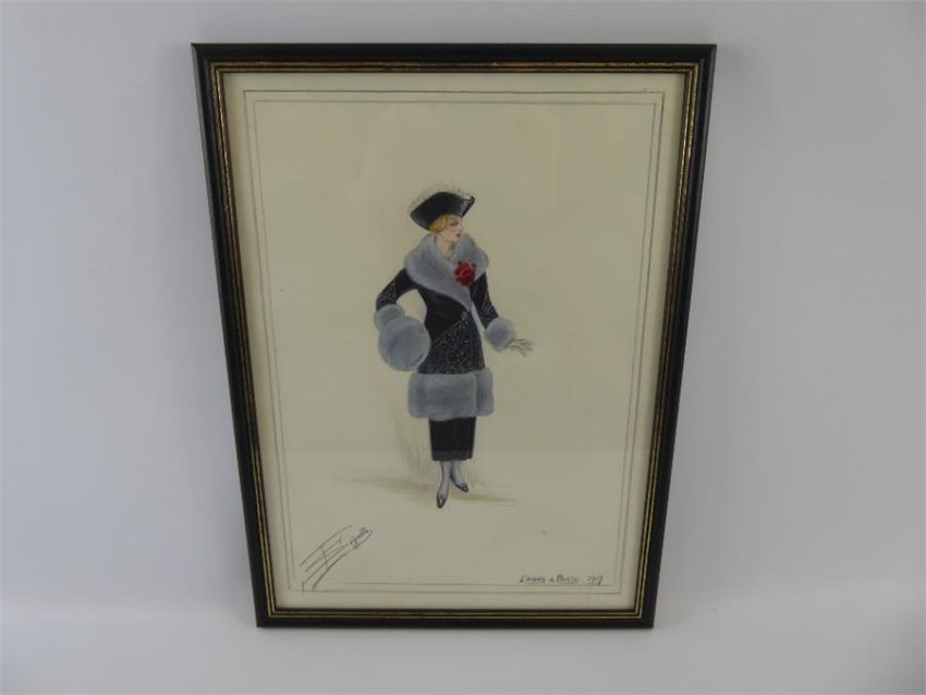 A Water-colour Painting depicting a fashionable lady, entitled "L'Hiver a Paris, 1917", approx 24 x 34 cms (io), glazed and framed.
