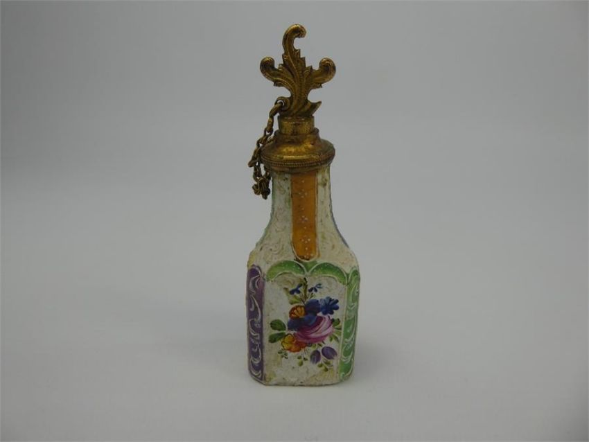 An 18th Century English Scent Bottle, hand painted with floral spray and colourful panels, gilt metal stopper with chain, 8.5 cms, raised factory mark to base.