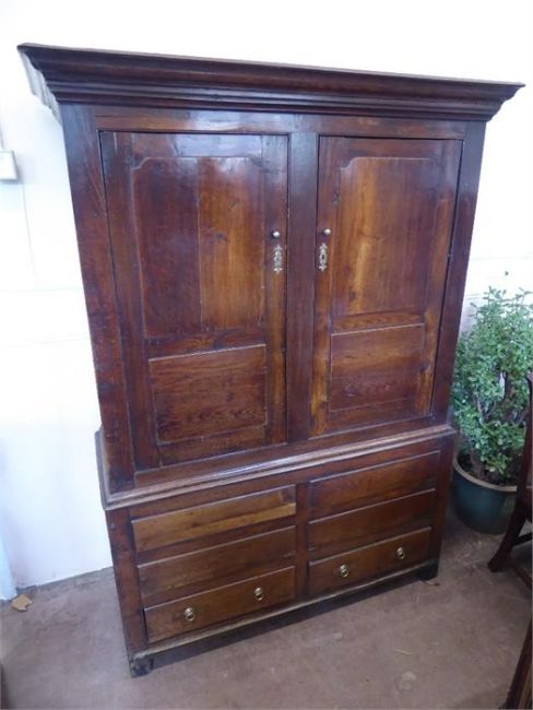 An Antique Oak Welsh Two Door Armoire/Linen Press Cupboard on square feet, double cupboard with two drawers beneath; the cupboard and four false drawers beneath being decorated with panelling, the sides with inset panelling and the top with a moulded overhanging; the keyholes, door knobs and drop ring handles to drawers being made of brass, approx 135 x 55 x 188 cms.