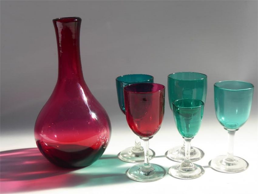 A Victorian Cranberry Glass Decanter together with a four Victorian port/wine glasses (three green, one red) and a green sherry glass.