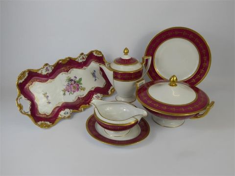 A Bavarian 'Royal Tettau' Part Dinner Service, including 12 dinner plates, 24 side plates, 12 soup plates and 10 soup bowls, two lidded vegetable dishes, a gravy boat on saucer, two meat platters, 12 tea cups and saucers, a teapot, and coffee pot together with a cake plate and sugar bowl. (92)