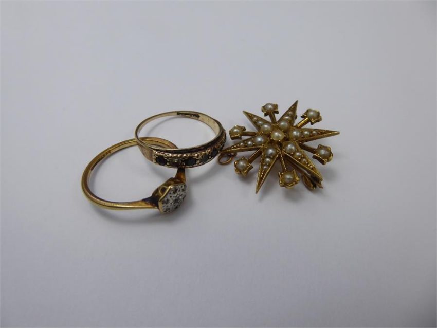An Edwardian 15ct Yellow Gold Seed Pearl Star Brooch, approx 26 x 26 mm, approx 4.4 gms together with an 18ct and platinum ring (af) size Q, approx 1.9 gms and a 9ct yellow gold blue and white stone ring, size P, approx 1.5 gms. (3)