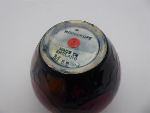 William Moorcroft 'Pomegranate' Small Vase Shape M55, approx 9 cms, made in England impressed, 1918-1926, no signature.