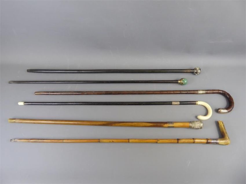 A Collection of Six Walking Sticks. Two sticks having stone grips, one with a bone grip, another a rosewood grip, one metal and one horn. (6)