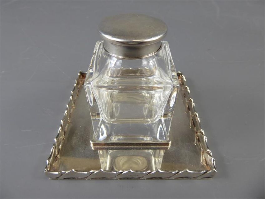 A Silver and Cut Glass Inkwell, stamped 925, the cut glass inkwell seated in a square silver well, stamped 925, mm DP.
