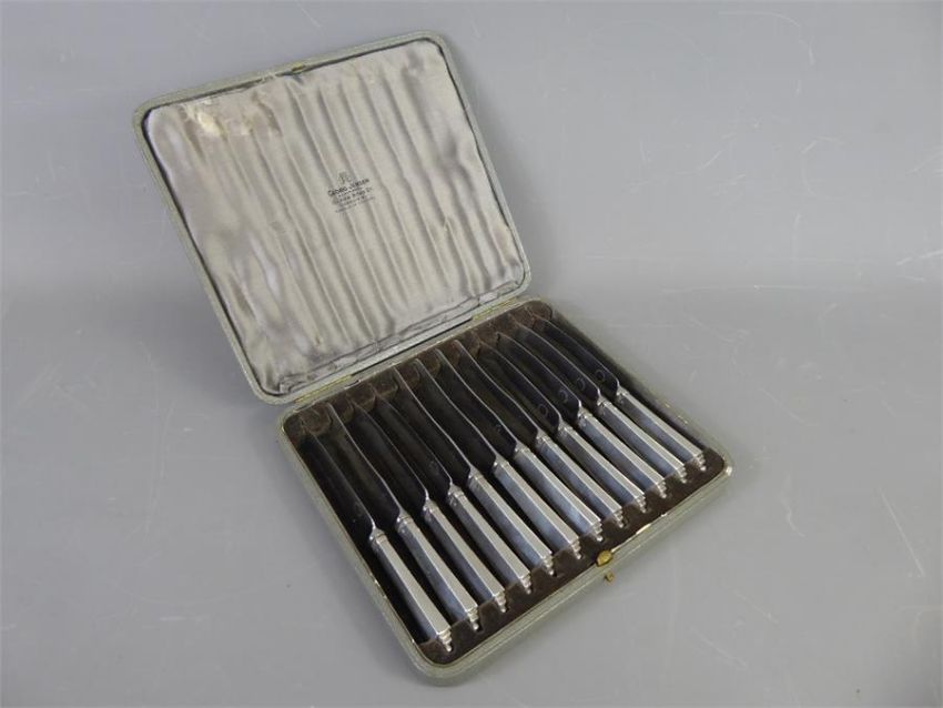 An Art Deco Set of Twelve Georg Jensen Pyramid Design Small Knives, in the original silk-lined Bond Street presentation box, stamped GJ Ltd.