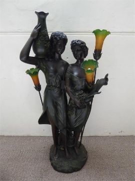 An Art Nouveau Style Spelter Floor Lamp. The lamp in the form of  two maidens, one holding a vase decorated with roses, the other a bouquet of flowers, three 'bluebell-shape' lamp shades, approx 117 cms high x 37 wide cms at the base. (af)