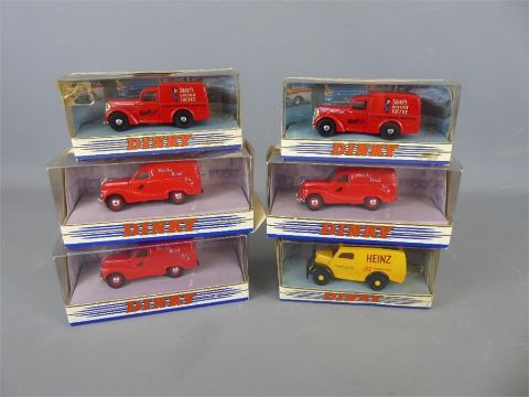 A Collection of Six Matchbox Dinky Die-Cast Toy Vans, including three 1953 Austin A40 'Brooke Bond Tea', two 1948 Commer 8 CWT 'Sharp's Super Kreem Toffee' and a 1950 Ford E83W 10 CWT 'Heinz 57 Varieties'.