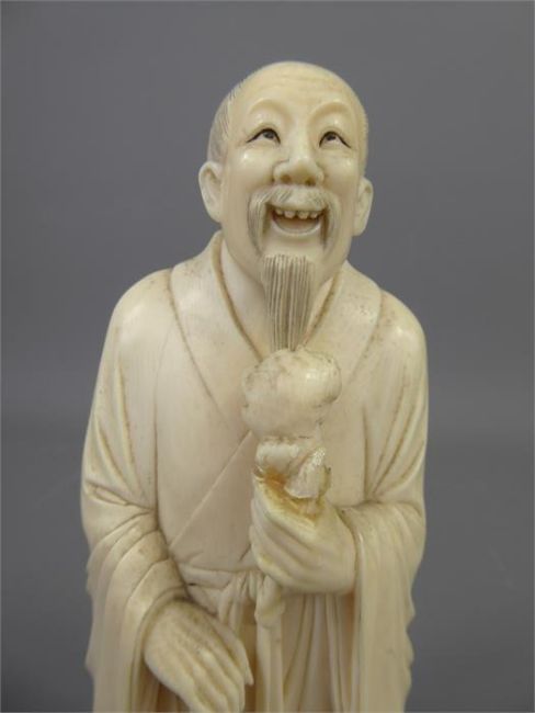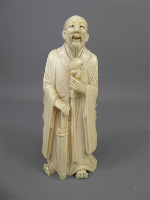 A Japanese Late Meiji Period Ivory Okimono, depicting a standing figure clasping an umbrella, approx 18 cms, presented on a rosewood carved square base. (the base shows signs of repair)