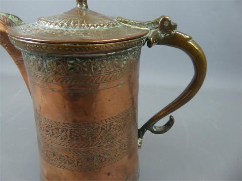A 19th Century Kashmir Copper Lidded Jug. The jug having banded leaf engraving, approx 22 cms high.