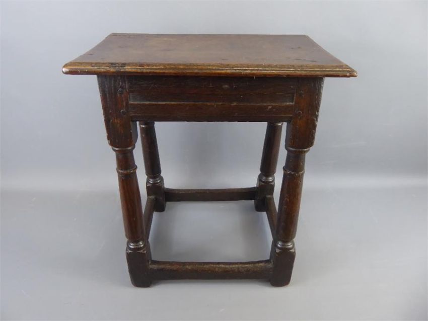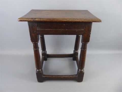 An Antique Oak Coffin Stool. The stool having turned legs, four straight stretchers and feet, approx 45 x 27 x 50 cms.