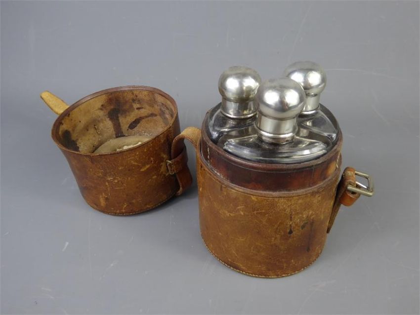A Glass and Silver Triple Hip Flask Set, Chester hallmark, marks rubbed, presented in the original cylindrical leather box. Two with original glass stoppers.