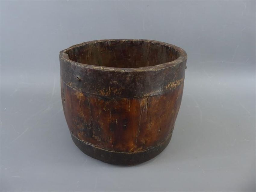 An Antique Oak Bucket, with cast iron strap work, approx 18 x 13 cms, together with a small antique oak wall-mounted plate rack, approx 85 x 75 cms.
