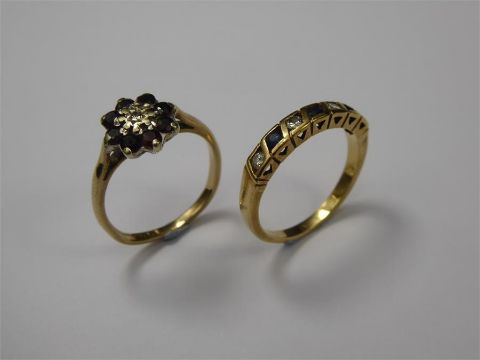 Two Rings, including 18ct (tested) Yellow Gold Half Eternity Ring, size L, approx 2.48 gms and a 9ct Yellow Gold Sapphire and Diamond Ring, 1 x 1 pt eight cut diamond and 8 x 2.4mm rubies, size K, approx 2.2 gms.