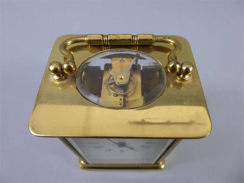 A Brass Carriage Clock, white enamel face with Roman numerals, approx 11 x 8 cms, Swiss SFRA, approx 8 x 7 x 10 cms