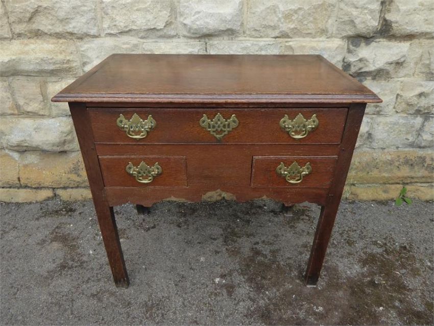 A Georgian Oak Low Boy, the table having a mahogany cross banded top, one long and two short drawers with brass swan-neck handles, shaped apron below and raised on square chamfered legs, approx 48 x 80 x 74 cms.