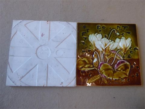 Six Vintage 6" Square English Majolica Floral Tiles, with moulded six radial line back stamp and central well, monogrammed 'JB'.