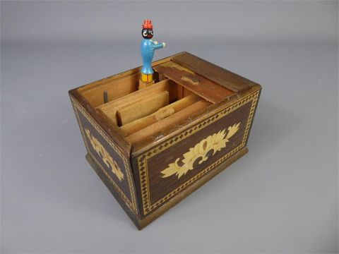 A Novelty Japanese Box Wood Marquetry Cigarette Dispenser, the slide-cover depicting Mount Fuji, which when opened reveals a golly, approx 12 x 9 x 8 cms. (af)