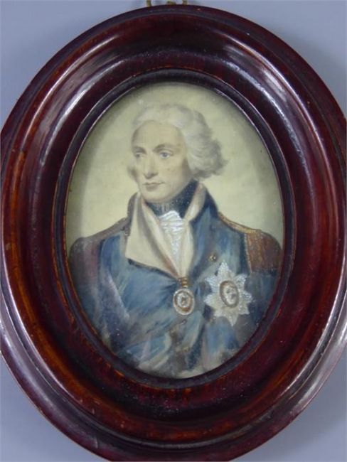 Manner of Jean Etienne Liotard (1702-1790) Portrait Miniature of Lord Nelson, paper label inscription to verso reads 'Lord Nelson specially painted on ivory to the order of Lady Hamilton, at Naples'. By Jean Etienne Liotard, approx 8 x 5.8 cms, Lord Nelson depicted in dress uniform with naval order, presented in an oval mahogany frame.