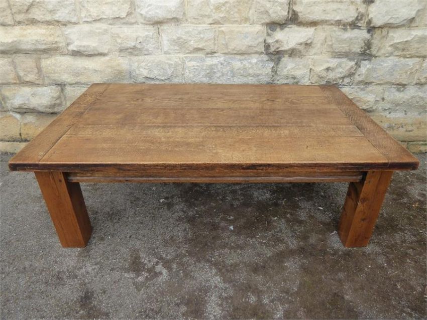 An Oak Three Plank Coffee Table, raised on thick square legs, approx 83 x 138 x 47 cms.